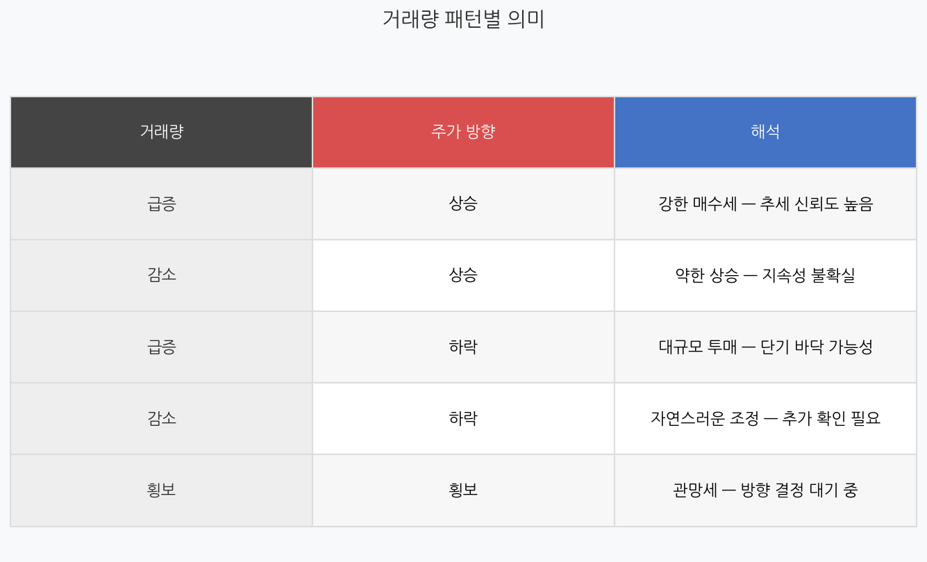 주가가 올라도 거래량이 없으면 허수라는 말이 있습니다. 거래량은 주가 움직임의 신뢰도를 판단하는 핵심 지표입니다. 거래량이 무엇인지, 어떻게 활용하는지 알아봅니다.