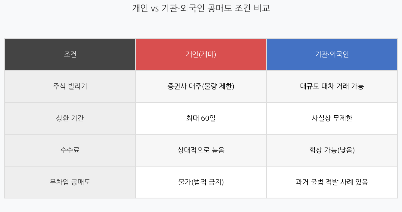 개인 vs 기관·외국인 공매도 조건 비교