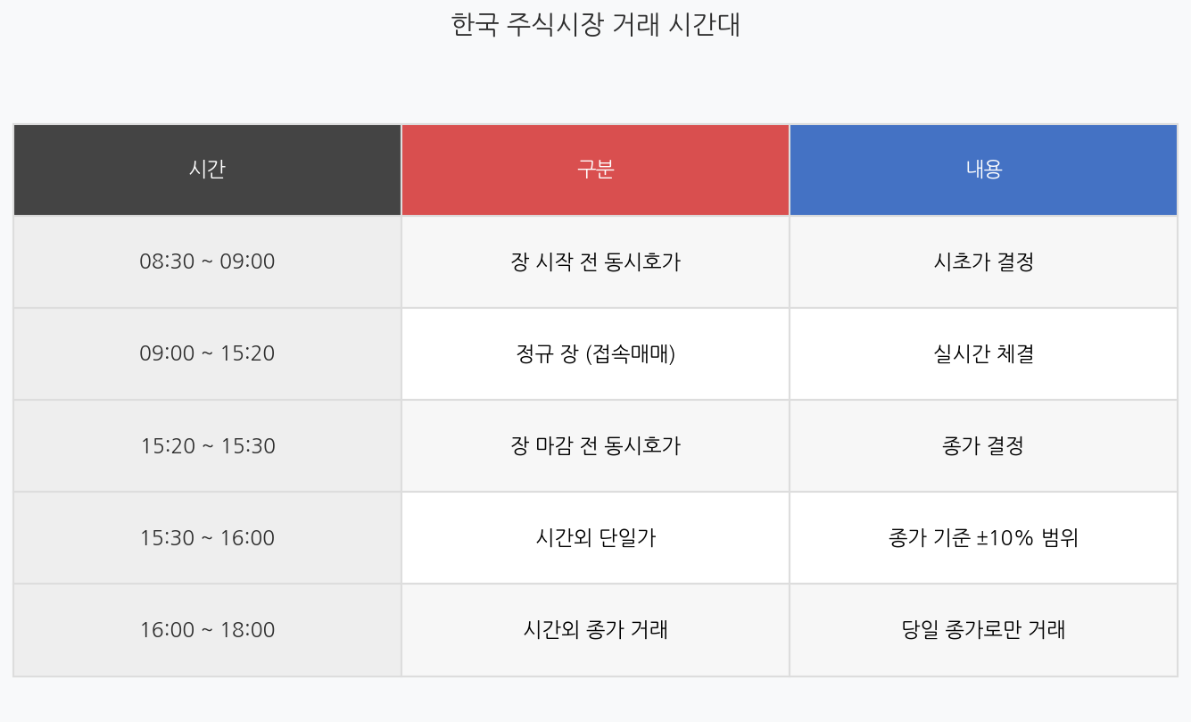 - 장 시작 전(08:30~09:00) 동시호가로 시초가가, 마감 전(15:20~15:30) 동시호가로 종가가 결정됩니다.