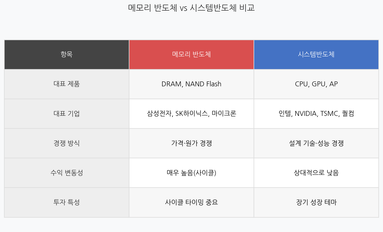 메모리는 사이클 산업으로 업황 타이밍이 중요하고, 시스템 반도체(특히 AI용 GPU·HBM)는 AI 성장에 연동되어 장기 성장성이 높습니다. 메모리는 단기 사이클 투자에, 시스템반도체·AI반도체는 장기 성장 테마 투자에 적합합니다.