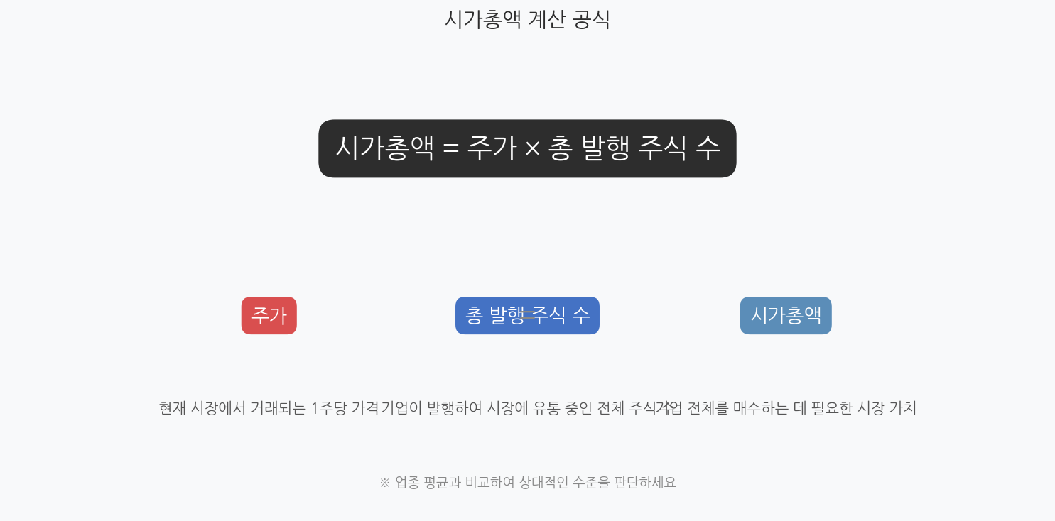 - 시가총액 = 주가 × 총 발행 주식 수로, 기업의 시장 가치 전체를 나타냅니다.