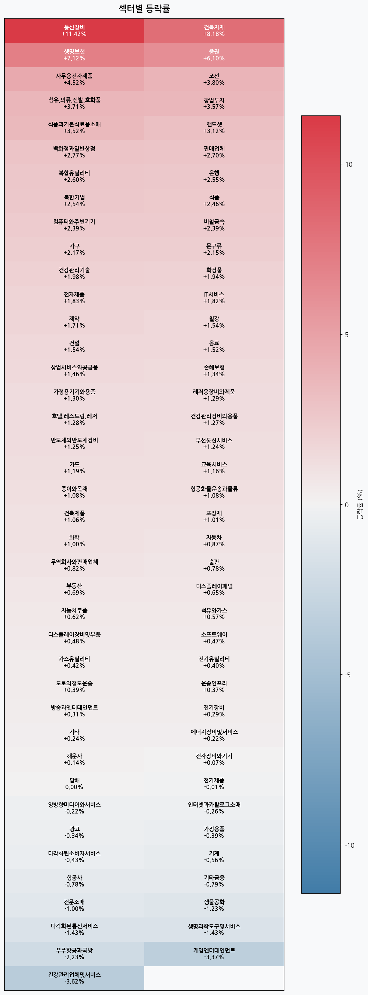 오늘 시장은 통신장비와 건축자재 섹터가 높은 등락률을 기록하며 강세를 보였습니다. 특히 증시 거래대금이 급증함에 따라 브로커리지(주식 위탁매매) 수익 개선 기대감이 커진 증권주와 주주환원 정책의 수혜가 예상되는 보험 업종이 두드러진 상승세를 나타냈습니다. 반면 이란 전쟁 조기 종식 기대감으로 인해 최근 강세였던 방산(우주항공과 국방) 섹터는 차익 매물이 쏟아지며 약세를 보였습니다.
