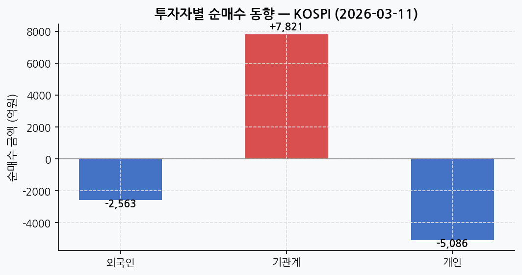 오늘 코스피 시장에서는 기관 투자자가 7,821억원 규모를 순매수하며 지수 상승을 주도했습니다. 반면 전날 1조원 넘게 사들였던 외국인은 2,563억원 순매도로 돌아서며 차익 실현에 나섰습니다. 개인 역시 5,086억원을 순매도하며 지수 상승세 속에서 물량을 덜어내는 모습을 보였습니다.