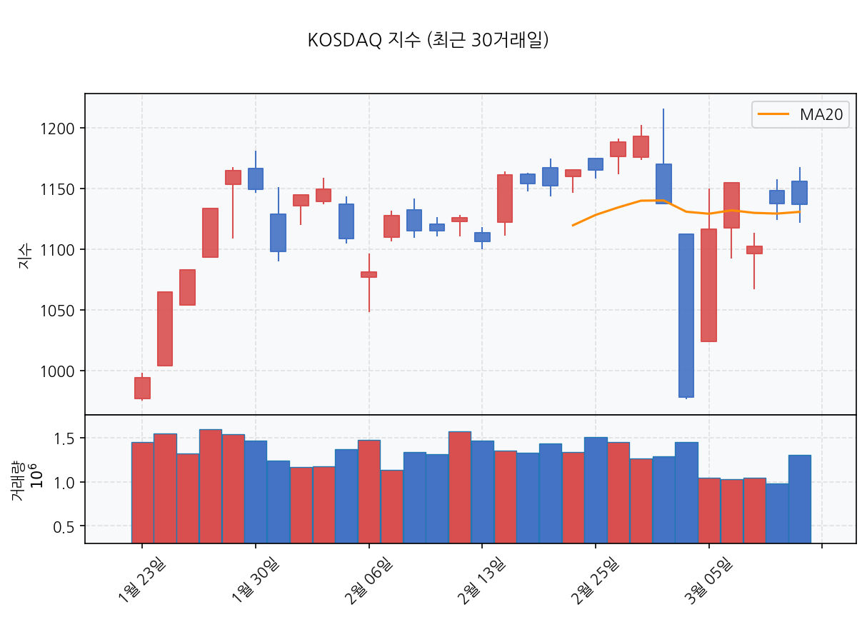 코스닥 시장은 1,155.48포인트로 상승 시작했으나, 장중 1,167.26포인트의 고점을 찍은 뒤 하락 전환하며 혼조세를 보였습니다. 최종적으로는 전일 대비 0.85포인트 하락한 1,136.83포인트로 마감하며 약보합세를 나타냈습니다. 장중 저가는 1,121.45포인트였습니다.