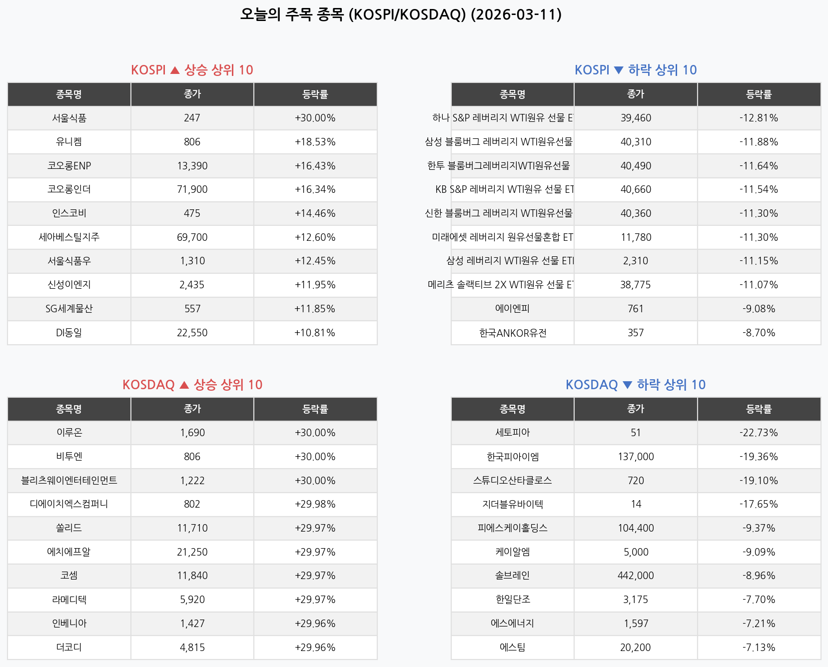 | 서울식품 | +30.00% | 개별 호재 및 저가 매수세 유입 |