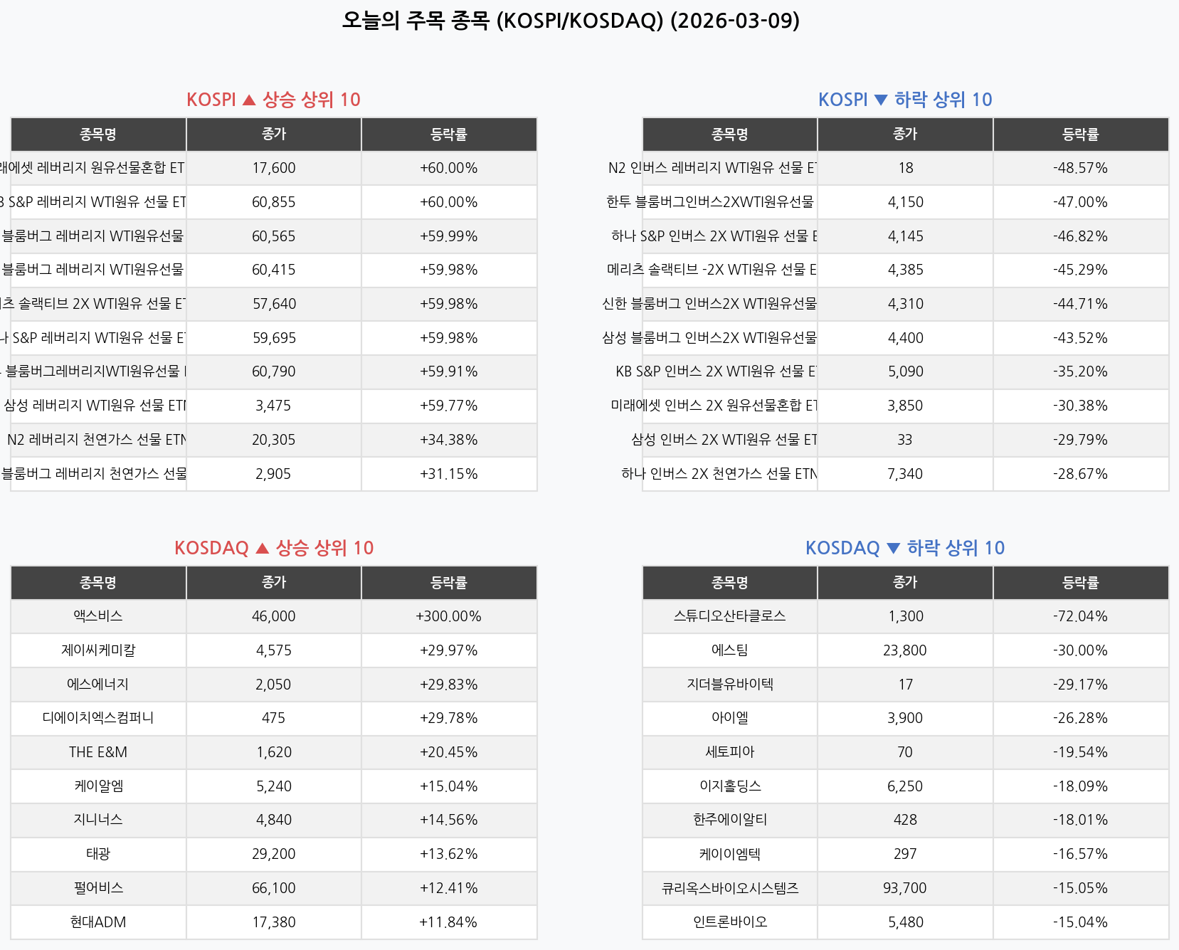 국제 유가 폭등의 최대 수혜주는 원유 관련 파생상품이었습니다. 미래에셋·KB·삼성 등의 원유 선물 레버리지 ETN들이 일제히 가격 제한폭 수준까지 치솟았습니다. 대성에너지(+21.23%)도 에너지 대란 공포감에 가스주로 매수세가 몰리며 강세를 보였습니다.