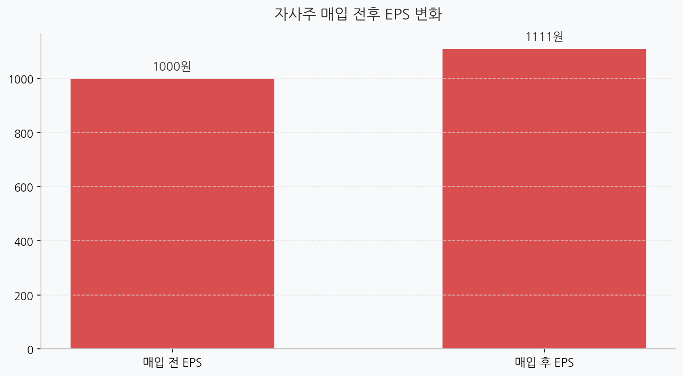 - 자사주 매입 후: 순이익 100억 원 / 주식 900만 주 = EPS 1,111원 (+11% 상승)