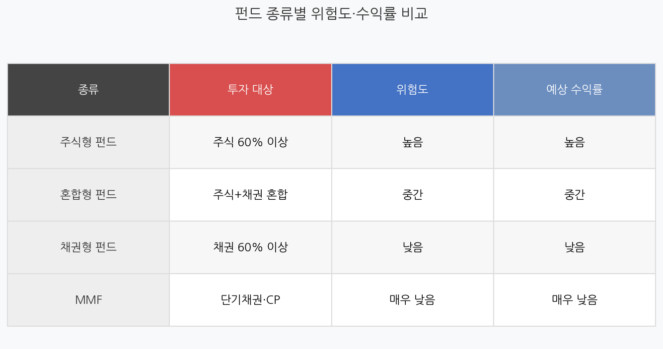 - 주식형·채권형·혼합형·MMF 등 위험도에 따라 다양한 종류 존재