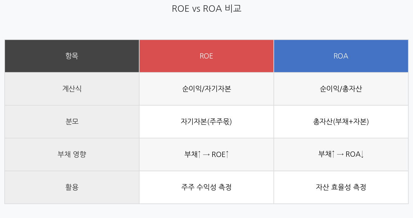 ROE는 '자기자본 대비 이익률', ROA는 '총자산 대비 이익률'입니다. ROE = 당기순이익/자기자본, ROA = 당기순이익/총자산. 부채를 많이 쓰는 기업은 ROE는 높지만 ROA는 낮게 나옵니다. 두 지표를 함께 보면 기업의 레버리지 수준을 파악할 수 있습니다.
